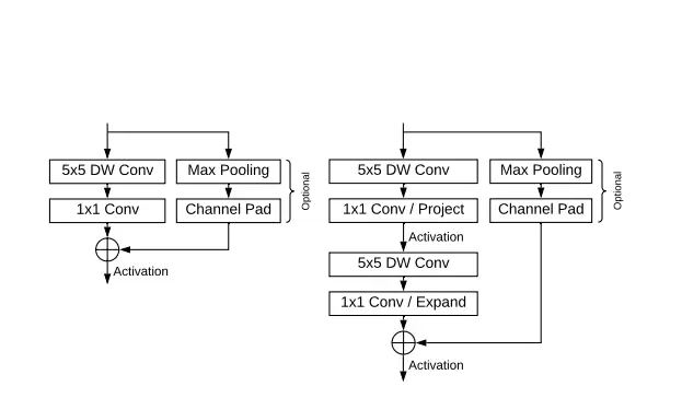该观察表明增加深度部分的核尺寸性价比更高。我们在模型架构中使用 5×5 内核,这样使得感受野达到指定大小所需的 bottleneck 数量大大减少,得到的 BlazeBlock 有下图所示的两种结构: