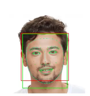 详细的关键点可以产生更精细的边界框估计(绿色),并在不运行人脸检测器的情况下重新用于后续帧中的跟踪。为了检测该计算节省策略的故障,该模型还可以检测面部是否存在所提供的矩形裁剪中合理地对齐。每当违反该条件时,BlazeFace 人脸检测器将再次在整个视频帧上运行。