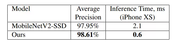 图 4 显示了所提出的正面人脸检测网络的平均精度(AP)度量(标准 0.5 交叉联合边界框匹配阈值)和移动 GPU 推理时间,并将其与基于 MobileNetV2 的目标检测器(MobileNetV2-SSD)进行了比较。我们在 16 位浮点模式下使用 TensorFlow Lite GPU 作为推理时间评估的框架。
