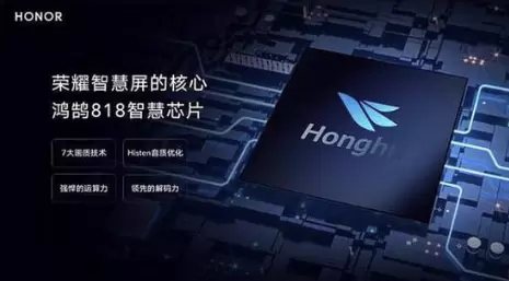 新闻报道显示:荣耀智慧屏将采用全新的海思鸿鹄818智慧芯片,这也是该芯片第一次亮相。鸿鹄818智慧芯片支持8K@30fps和4K@120fps的视频解码能力,支持6400万像素的图片解码,内置两个A73 CPU、两个A53 CPU和4个Mail-G51 GPU,同时该芯片集成Histen音质优化技术。