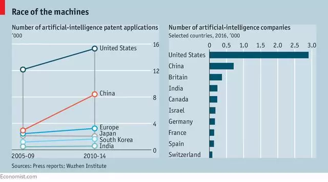 2016 年 10 月,白宫的一份报告指出,在人工智能的分支深度学习方面,中国发表的相关期刊文章已然超越了美国。咨询公司普华永道预测,在 2030 年之前,与人工智能相关的发展将会促使全球 GDP 增长16亿美元;据估计,近一半的财源都将累积至中国。尽管美国在绝对数量上仍然领先,但近几年来,中国研究人员所提交的人工智能相关的专利申请数量增加了近 200%。