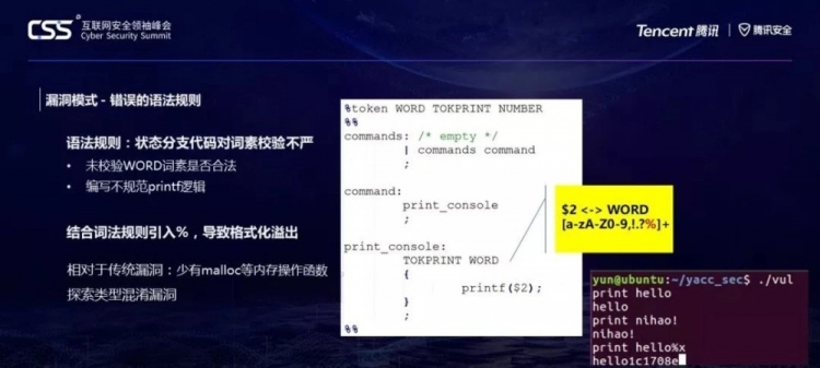 安全平台部旗下前沿技术安全研究团队Tencent Blade Team成员钱文祥及李宇翔,则在CSS 腾讯安全探索论坛(TSec)上进行了议题分享,和与会者共同讨论了如何挖掘语法解析器规则漏洞。