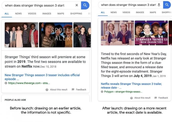 而新算法就是为了提高Google对可能随时间变化的信息类型的理解并为用户提供最相关的结果。例如,当你想知道一个新节目的首播日期,Google将尝试查找出并提供更精确日期的最新结果,而不是根据一篇较老的文章提供信息。
