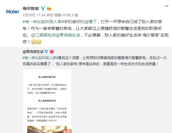 不同于晒对象、晒猫狗等“姿势端正”的用户,海尔智慧家庭的粉丝将这里当成倾诉羡意、暗示老公的“祈愿池”,包括回家后启动“女王模式”、智慧冰箱献艺“报菜名”、用洗衣机RFID识别功能“低调”秀出大牌奢品……围观群众也左一句“去哪买”,右一句“真好玩”,热度飙升到“海尔智家”官博实名撒娇:“手机都被@爆。”可见,这些早早体验上智慧生活的“上头”用户,对美好生活的追求正变得多样、好玩和有趣。
