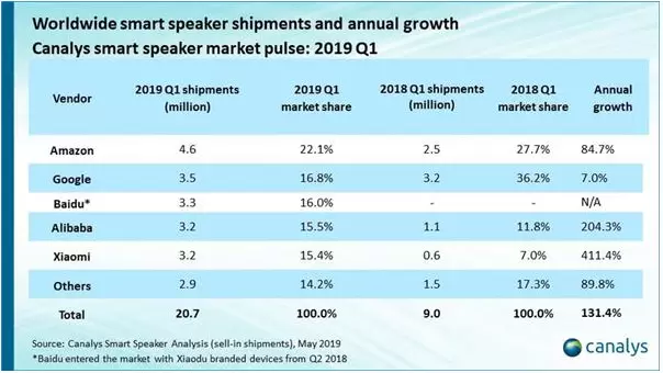 其实早在之前,关于谷歌和亚马逊在智能音箱市场的竞争态势,科技创投基金Loup Ventures就表示更看好以技术为先的谷歌,预计谷歌智能音箱销量将在2023年反超亚马逊。反观国内智能音箱市场,百度近来的发展势头与谷歌类似,后发居上,在Q1反超阿里成为国内出货量第一的智能音箱。可以推测,在产品技术体验上的优势则是未来致胜的关键法宝。