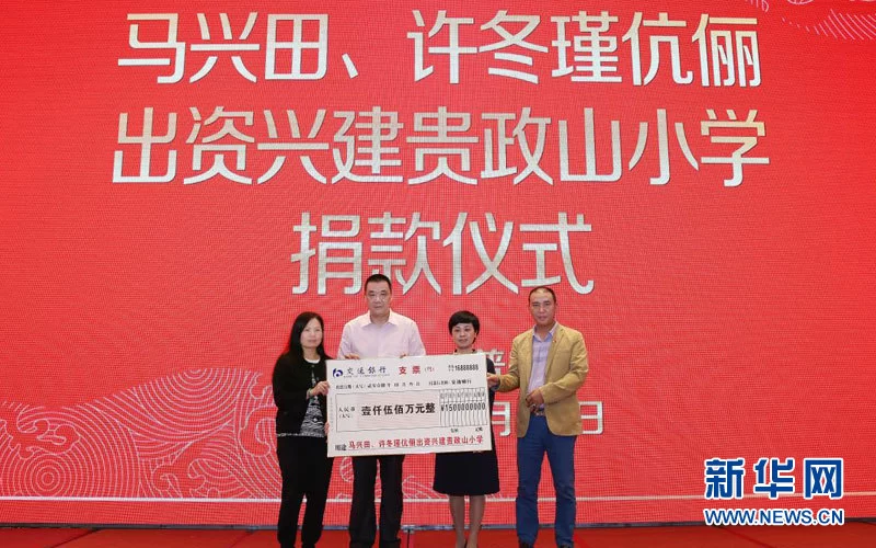 仪式上,马兴田、许冬瑾伉俪向副市长方锦屏、贵政山村支部书记纪金池捐赠1500万元专项支票。