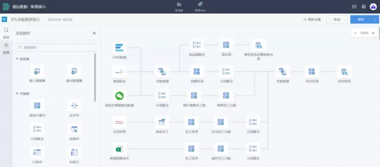 观远数据的智能ETL将业务逻辑处理过程中的每一步都细化成“原子”级别的操作,可实时预览实时保存,简单地拖拽就可以进行数据加工处理。张进认为,业务知识是企业非常重要的数据资产,也需要有相应的产品与功能承载,所以在智能ETL里面有着文档化编辑编排界面,可以使得企业将这样的业务逻辑沉淀在观远智能分析平台里。