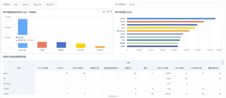 数据分析能产生更大价值的关键在于,是否能够高频的被大多数用户使用,这比项目上线本身更为重要。观远数据智能分析平台不仅在操作体验上极近贴合用户的使用习惯,让更多不懂IT的业务人员也能轻松地用起来;同时,平台上还内置了用户行为监控模块,谁在用产品、用的频次如何、他在看什么......所有信息一目了然。