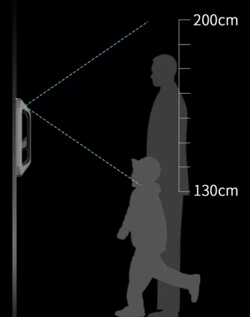 市场上的人脸识别锁大多摄像头视场角小,识别时身高较高的用户要低头,要么要先唤醒,然后回撤一步才能开门。R5摄像头垂直角度可识别范围从1.3m到2.0m,保证一家老小不用踮脚、不用弯腰、不用晃动就可轻松识别。