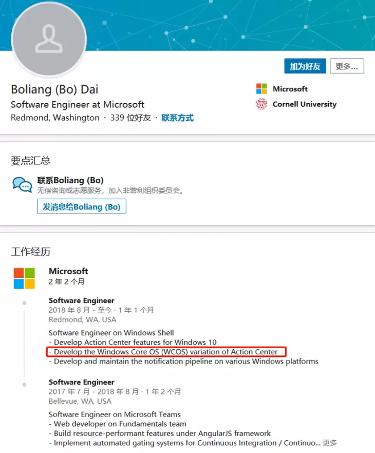 外媒在微软一位工程师的个人资料中发现“Windows Core OS version of Action Center(操作中心)”相关字样,这为此前有关Windows Core OS的传闻提供了新线索。
