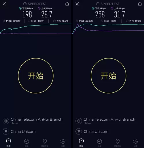 除了使用百度网盘进行了测试之外,我也分别在宽带模式与4G双宽带模式下用Speedtest进行了上下行的网速测试,通过结果可以看到,在有线宽带和4G双宽带模式下,网速有着极大的提升,从198M提升至258,上传速率同样有着显著的提升,可见宽带叠加的效果极为显著。