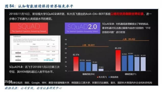 由报告可知,科大讯飞认知智能领域处于世界领先水平,其自然语言处理(NLP)取得重大突破,技术国内领先。2018年,公司在斯坦福SQuAD、SQuAD2.0机器阅读理解大赛中夺冠;讯飞“智医助理”机器人在执业医师笔试测试中取得了456分的成绩,超过临床执业医师合格线(360分),属于全国53万名考生中的中高级水平。