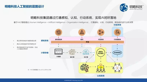 通过融合计算机语音及图像识别、自然语言处理、深度学习,知识图谱及智能搜索,决策建模等核心技术,打造多维感知数据汇聚、治理管控、共享服务平台,推理与知识服务平台,行业应用平台,形成从信息收集、推理判断到行动执行的AI闭环,实现人类智能、人工智能与组织智能三位一体,从而打通感知,认知,分析和决策,构建人机协同智能系统。