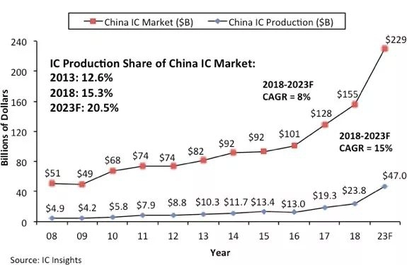 行业权威研究机构IC insights认为,中国市场容量,将在接下来的五年内迎来8%的高增长,这对于趋于稳态的半导体产业内非常可观。更加令人期待的,是进口替代红利,国产芯片自给率预计在2023年超过20%,本土自产芯片的年复合增长率有望达到15%。