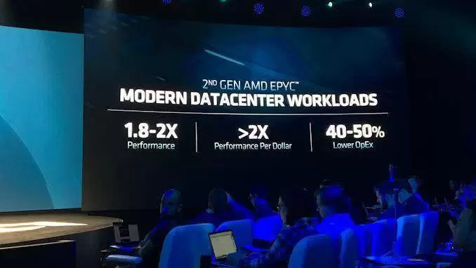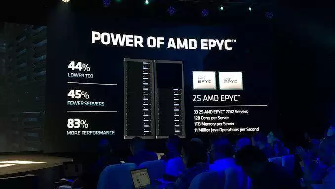 前代EPYC(霄龙)处理器采用了14纳米制程,二代则直接跳过10纳米、采用最新的7纳米制程工艺,浮点性能是前代4倍、功耗则降低一半,实现了更高的性能和更小功耗,这个部分显然是企业用户所看重的。