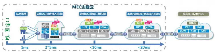 MEC边缘云不限制网络的部署方式,总的来讲,可以按照不同业务场景以及时延方面的需求进行灵活的部署,通常可部署在接入机房、汇聚机房、地市核心机房等位置,如下图所示: