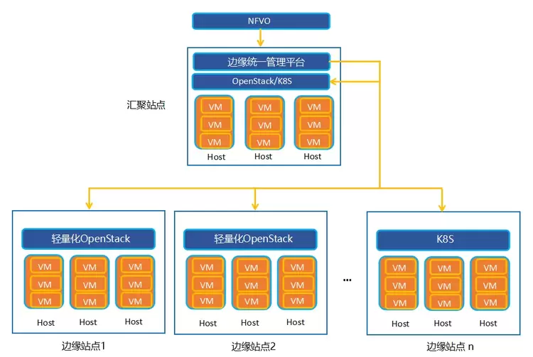 对所有边缘节点上的资源池 (如计算、存储、网络等)进行统一管理和分配,提供统一的界面集中监控各边缘节点上物理资源的拓扑、告警、性能、容量等信息,并为基础设施管理员提供日志和告警分析等故障定位手段。NFVO只部署在上层的汇聚节点,直接对接边缘云统一管理平台,避免和所有边缘节点的资源池进行对接,对所有边缘节点上部署的虚机(VM)/容器进行统一编排和部署。