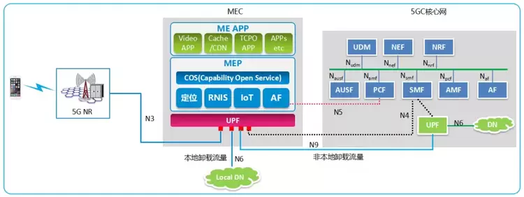 为了满足5G应用场景大带宽和低时延的特性要求,MEC边缘云在部署时将与5G网络架构深度融合,其业务分流、策略控制、Qos保证等功能,都将通过标准的5G网络功能实现。基于5G核心网的C/U分离式架构,用户面功能UPF(User Plane Function)需要下沉到网络边缘部署,以减少传输时延,实现数据流量的本地分流。控制面功能网元如SMF则在中心DC集中部署,便于统一控制部署在MEC的UPF,统一配置和下发分流策略。