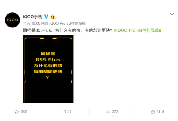 今天,iQOO官方微博正式宣布,iQOO Pro将配置骁龙855Plus处理器:“同样是855Plus,为什么有的快,有的却能更快?”这与之前官博的疯狂暗示一致。不过,这微博似乎为iQOO Pro的性能旗舰定位埋下了伏笔。作为同样的硬件配置,为何iQOO Pro的骁龙855 Plus要比其它的更快呢?关于这个问题,iQOO产品经理给出了答案。