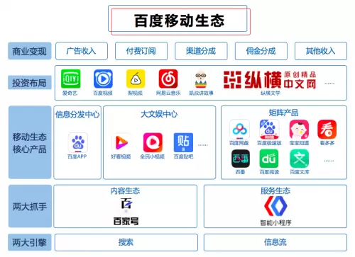 进入移动互联网时代,互相独立的App割裂了PC时代互相打通的内容,搜索引擎可以获取的优质内容量因此减少,为改变这种局面,百度发力百家号为移动端提供优质内容,2018年又发力智能小程序,在把百度App打造成为国内最大的综合性内容消费和服务平台的同时,用智能小程序打破信息壁垒,构建新的内容生态环境。