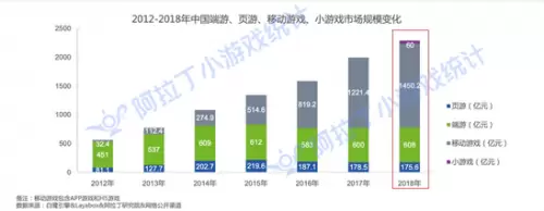 与免费阅读的流量入口一样可观的,还有小游戏。阿拉丁统计数据显示,2018年国内小游戏市场规模从无到有已达 60 亿元,用户每日使用时长从1月平均每天的5.29分钟到12月的17.36分钟,上升了228%。