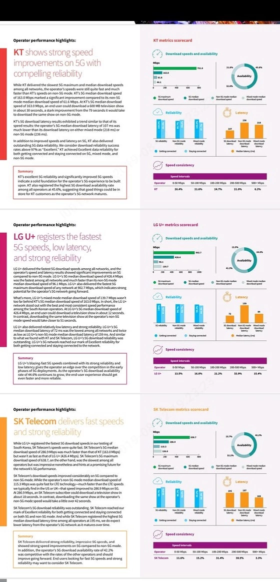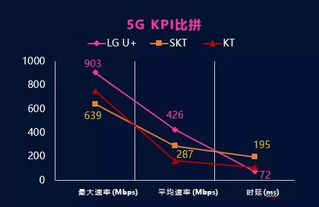 2、 LG U+下载速率平均值最高:LGU+ 426.4,SKT 286.9,KT 163(单位:Mbps)。对比可得LG U+是SKT 1.5倍,是KT 2.6倍。