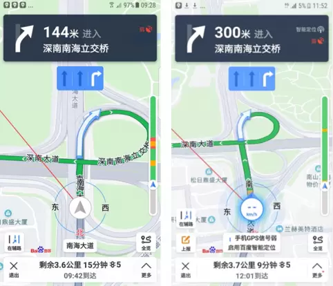 (左:GPS定位导航卡顿 右:智能定位,导航正常运行)