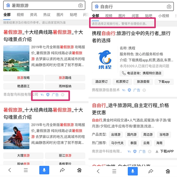 一年一度的暑期旅游旺季到来,随着网络经济的不断发展,越来越多用户通过百度搜索旅游目的地、旅行经验分享、旅游预订平台等信息。8月13日,百度发布旅游保障升级计划,推出四大举措。用户全网搜索旅游相关关键词时,会在搜索结果中的广告内容出现蓝色的盾牌型“保”字标识。用百度APP搜索“旅游”、“自由行”等旅游相关核心高频关键词,在搜索结果顶部,有相应的风险提示。同时,百度还引入了第三方机构中华人民调解委员会,当用户在旅游等各个领域遭遇纠纷时,可以帮助用户通过线上线下联合的方式进行维权。此外,百度还通过AI技术,对旅游广告和自然搜索结果进行清查。