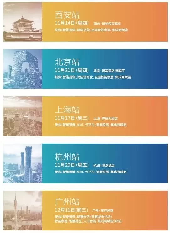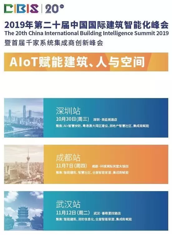 为了让智能化企业更好地把握行业发展趋势,分享交流最新技术应用成果。于2019年10月30日至12月11日期间,分别在北京、上海、广州、深圳、杭州、武汉、成都、西安八大城市举行的第二十届中国国际建筑智能化峰会主题将主题聚焦:AIoT赋能建筑、人与空间。届时峰会将带来关于AI、云计算、大数据、IoT、智慧城市、智能家居、智慧安防等最新技术应用与分享,探讨AIoT赋能建筑、人与空间。