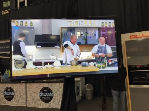 本届展会上,老板电器与当地著名咖啡品牌Jacobs合作,搭建体验式厨房,特邀两位当地非常著名的厨师现场使用老板电器的产品进行Jacobs Cooking Show展示,并做了电视转播。