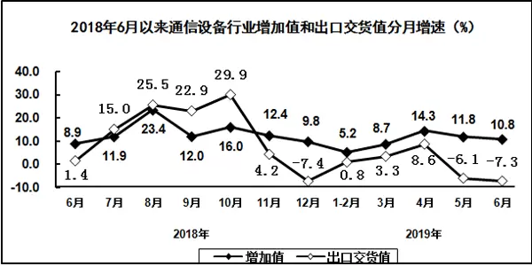 数据显示,上半年,通信设备制造业增加值同比增长9.6%,出口交货值同比下降0.1%。主要产品中,手机产量同比下降6.9%,其中智能手机产量同比下降4.8%。