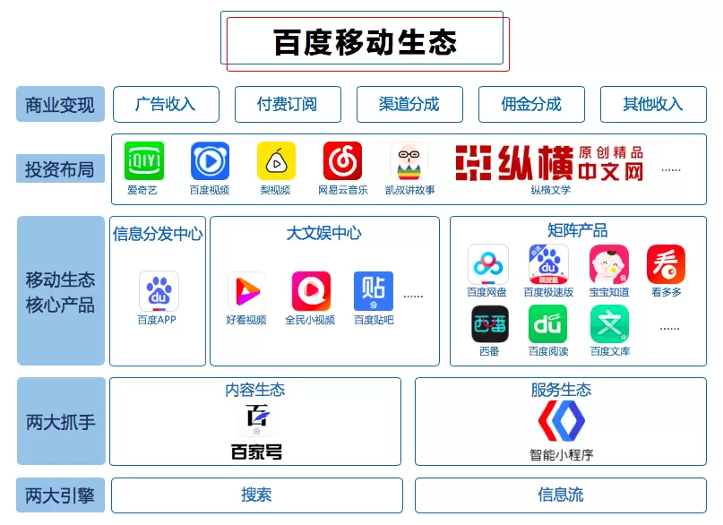 百度App不是孤军作战,基于百度搜索和百度App的流量溢出效应,百度构建产品矩阵和开放生态。百度跟腾讯一样形成“1+N”的产品架构,1是百度App,是分发入口,N是垂直应用,包括百度网盘、宝宝知道、看多多、百度文库、百度阅读、西番、百度极速版、百度知道、好看视频、全民小视频、百度贴吧等矩阵产品;在生态层面,百度有爱奇艺、好看、梨视频、网易云音乐、知乎、纵横中文网等内容布局,覆盖各个内容赛道;还有携程、有赞、糯米等服务布局。
