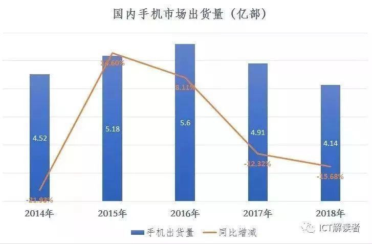 中国信息通信研究院的权威报告显示,在经历了2015-2016年的4G手机换代潮之后,国内手机市场出货量自2017年开始结束了为期两年的高速增长期而步入下滑状态,2018 年全国手机总体出货量只达到4.14亿部,同比下降了15.6%,为2014年以来的最低出货量。