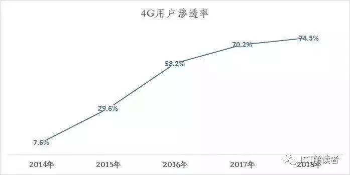 回顾4G用户的发展历程,在商用牌照发放后历经一年时间的市场推广,2014年底的4G新增用户实现9728万,渗透率仅达到7.6%,这还是在中国移动的3G网络TD-SCDMA竞争力弱于对手的驱离效应之下才发生的。