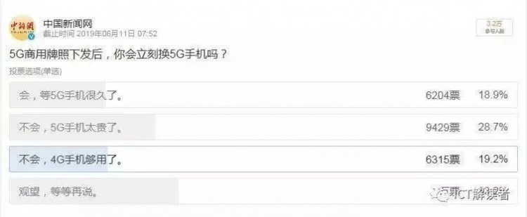 中国新闻网在社交媒体微博上发起了一个“5G商用牌照下发后,你会立刻换5G手机吗?的小调查,在截止目前3.2万人的投票选项中有33.2%的的用户选择“观望,等等再说”,另有48.9%的用户因为顾虑于5G手机价格高和5G应有场景不明确而投下反对票。这充分反映了普通民众对待提前迈入5G时代的犹豫心态。