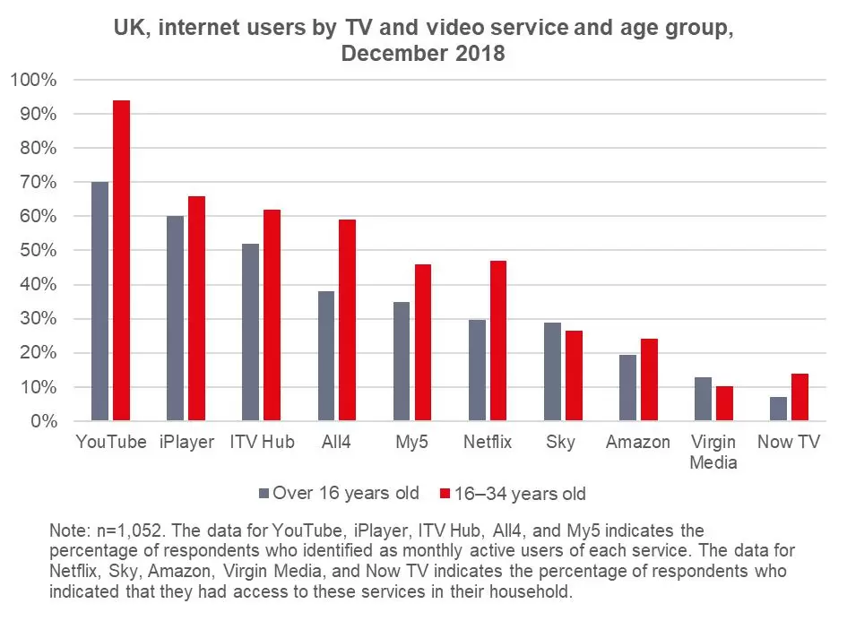 ·在令人垂涎的16-34岁人口中,Netflix拥有的用户数量(47.0%)超过Sky及其类似于Netflix的Now TV服务总用户数量(40.2%)。