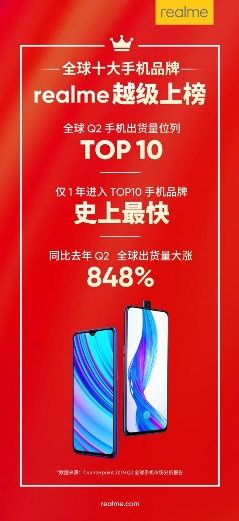 根据Counterpoint最新发布的报告,realme在2019年第二季度成功入围全球十大手机厂商的行列,仅用时一年便进入全球TOP 10,使得realme成为最快跻身主流手机厂商行列的品牌。