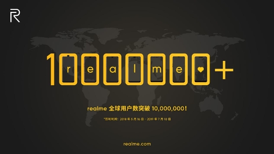自2018年5月16日发布第一款产品以来,截止2019年7月10日,realme成立仅一年多时间就已在全球范围内拥有超过1000万用户,并成功进入中国、印度、东南亚以及欧洲等全球20多个市场。