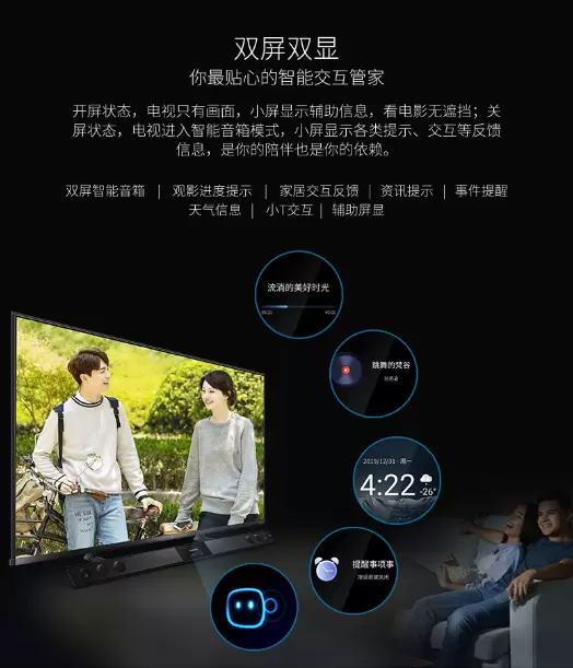 TCL C10电视是全球首款双屏+双芯的量子点电视,除了电视的主屏幕外,还创新的将一块小屏幕设计在分体式的智能音箱上。