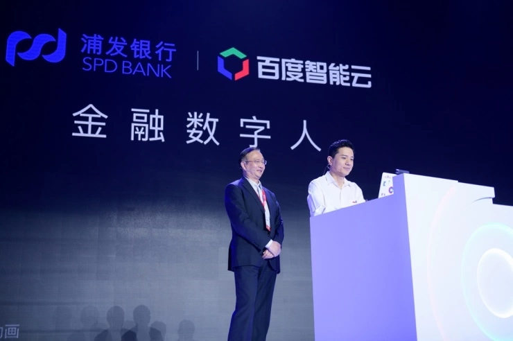 (2019年7月3日,百度AI开发者大会上,李彦宏介绍了百度智能云的最新落地应用成果以及与浦发银行联合创造的金融领域首个“数字人”员工)