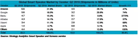 知名市场调研公司Strategy Analytics近日发布的2019年第二季度智能音箱出货量调查报告显示,小度以470万台的出货量蝉联国内第一,全球第三。此前,尼尔森发布的智能音箱市场品牌认知调查报告显示,2019年第二季度,小度在用户心目中智能度、美誉度和健康度均领先,率先在用户心目中形成“智能音箱第一品牌”的印象。