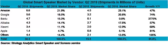 日前,知名数据调研公司Strategy Analytics发布了2019Q2全球智能音箱出货量报告。数据显示,小度出货量稳居国内第一、全球第三。从Strategy Analytics发布的数据来看,小度Q2同比增长3775%,以470万台的出货量成功卫冕。随后,在智能音箱市场同样具有较大影响力的Canalys也发布了2019年第二季度全球智能音箱出货量报告,小度出货量超越谷歌成为全球第二,市场地位再次提升。