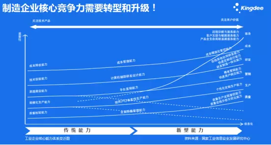 传统制造企业在进行数字化转型升级时,对这研发创新、生产管控、供应链管理、财务管控、经营管控五大能力进行重新组合,形成新的管控重点,这些新的管控重点需要工具去落地。金蝶认为制造企业转型:连接是前提,先进制造是关键,制造企业全价值链在线是重点。