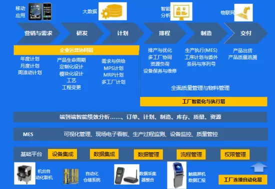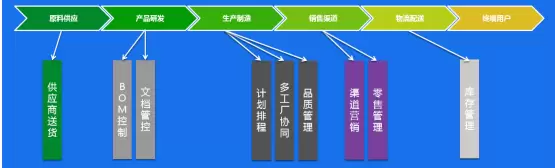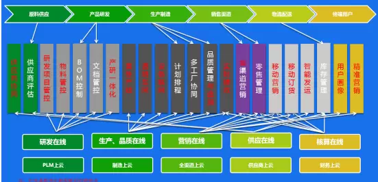 制造企业的价值链覆盖原料供应、产品研发、生产制造、销售渠道、物流配送、终端消费者,包括研发创新、生产管控、供应链管理、财务管控、经营管控五大类能力。