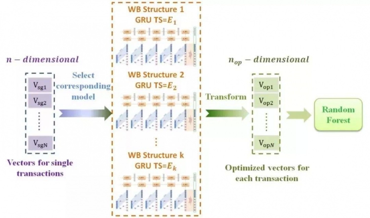 在这样的场景下,两大技术融合才是更好的解决路径:区别于传统的分类器方法或单一的RNN方法,银联电子商务与电子支付国家工程实验室和众安科技,以及英特尔公司共同提出了GBDTGRURF三明治结构欺诈侦测模型架构。