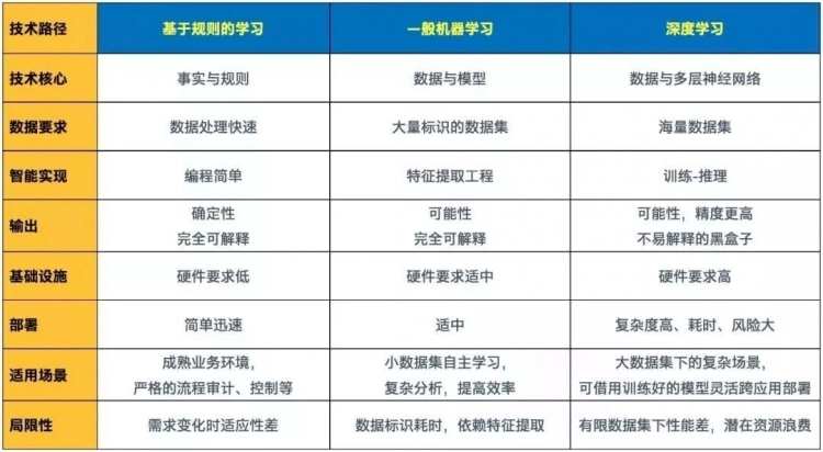 深度学习、一般的机器学习和基于规则的学习都是目前AI领域的主流技术路径,下图为这三种AI技术路径的优势与局限性: