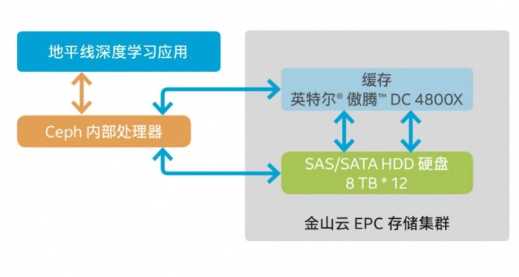 在金山云EPC存储集群采用的分级存储方案中,非活动数据存放在HDD硬盘组成的存储池,而活动数据则被置放在由英特尔傲腾固态盘DC PDC P4800X构成的缓存区中。