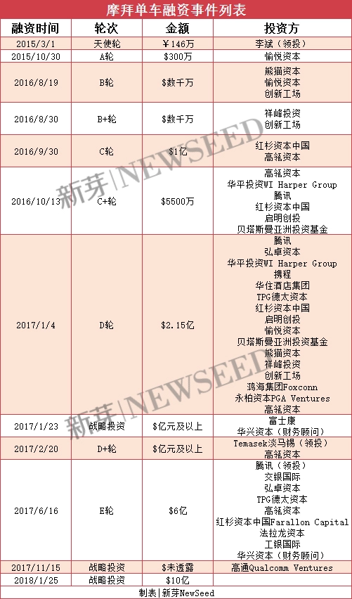 经新芽NewSeed查阅融资数据,其实在2018年1月份,摩拜曾完成一笔10亿美元的战略融资,但投资方并未披露。而此次卖身美团,不禁令人遐想这轮融资确实是由美团方操刀完成。