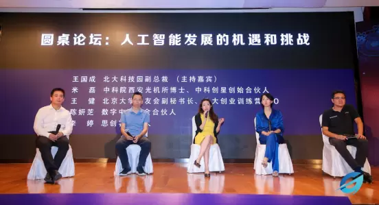 北大科技园副总裁王国成,中国科学院西安光学精密机械研究所博士、中科创星创始合伙人米磊,北京大学校友会副秘书长、北大创业训练营CEO 王健,数字中国基金创始合伙人陈妍芝,思创客创始人李婷等五位嘉宾,围绕“人工智能发展的机遇和挑战”的主题展开了圆桌论坛。