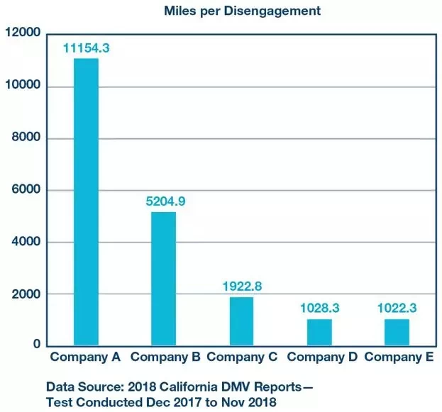 (图1)五大自动驾驶制造商在加州的测试数据:每次脱离人为接管后自动驾驶系统的平均行驶英里数(2017年12月至2018年10月)。